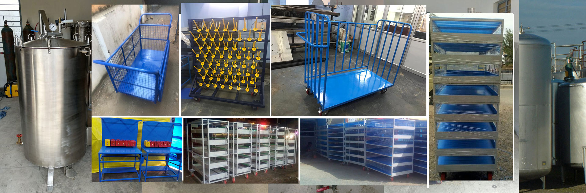 We are designing and fabricating trollies , conveyers, chutes, stands in Stainless steel grade 304 / 316 / 316L and in Mild Steel.
